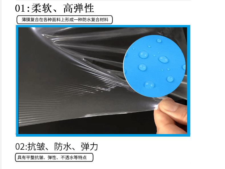 柔軟。耐沖性高,伸長(zhǎng)率大,拉伸性?xún)?yōu)。透明性能優(yōu)良,防水透氣,無(wú)毒環(huán)保。